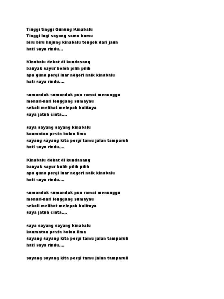 Tinggi tinggi Gunung Kinabalu Tinggi lagi sayang sama kamu biru biru hujung kinabalu tengok dari jauh hati saya rindu Kinabalu dekat di kundasang banyak sayur bulih pilih pilih apa guna pergi luar negeri naik kinabalu hati saya rindu. G Tengok dari jauh. KIMIN MUDINLIRIK Tinggi tinggi Gunung KinabaluTinggi lagi sayang sama kamubiru biru hujung kinabalu tengok dari jauhhati sa.